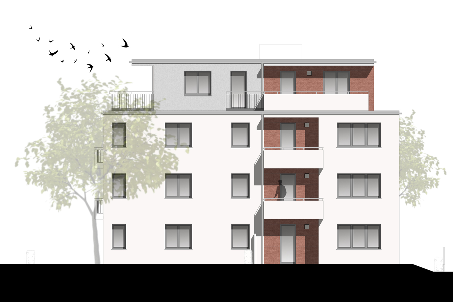 Das Quartier markiert den Übergang von größeren Wohnriegeln hin zu einer lockeren Bebauung mit Mehrfamilienhäusern verschiedener Epochen. Sowohl Kubatur als auch Farbigkeit und Materialität vermitteln hier. Während die Gebäude überwiegend im klassischen Weiß gehalten sind, setzen Vorhangfassadenplatten an den zurückgesetzten Bereichen der Balkone und an den Treppenhäusern Akzente. Die Farbigkeit lehnt sich damit an die Umgebungsbebauung an.