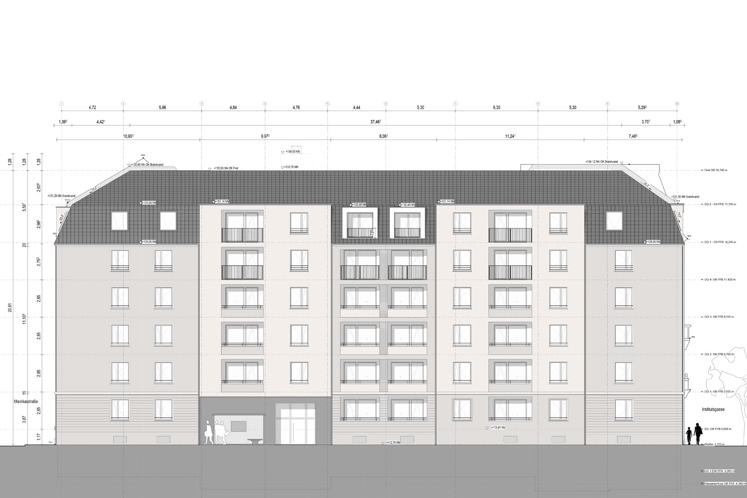 Das Gebäude bildet den Abschluss der vorhandenen Blockrandbebauung mit einem Hauseingang von der Schäferstraße, einem Hauseingang von der Institutsgasse sowie einer Tiefgaragenzufahrt von der Manitiusstraße. Im Innenhofbereich wird eine grüne Außenanlage mit Spielplatz errichtet