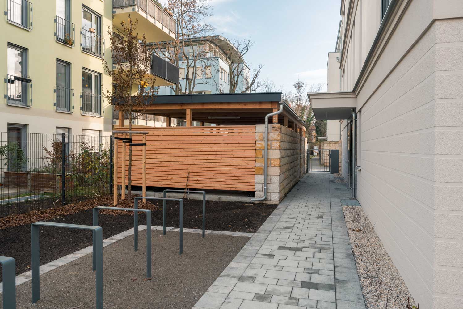Das Gebäudeensemble fügt sich sensibel in die gewachsene innerstädtische Struktur der Dresdner Neustadt ein. Charakteristische Elemente der umliegenden Gründerzeitbebauung wurden aufgegriffen und zeitgemäß interpretiert. Die Materialität aus Putz, Holz und Stahl unterstreicht den hochwertigen architektonischen Anspruch und verleiht dem Projekt eine klare, moderne Identität.