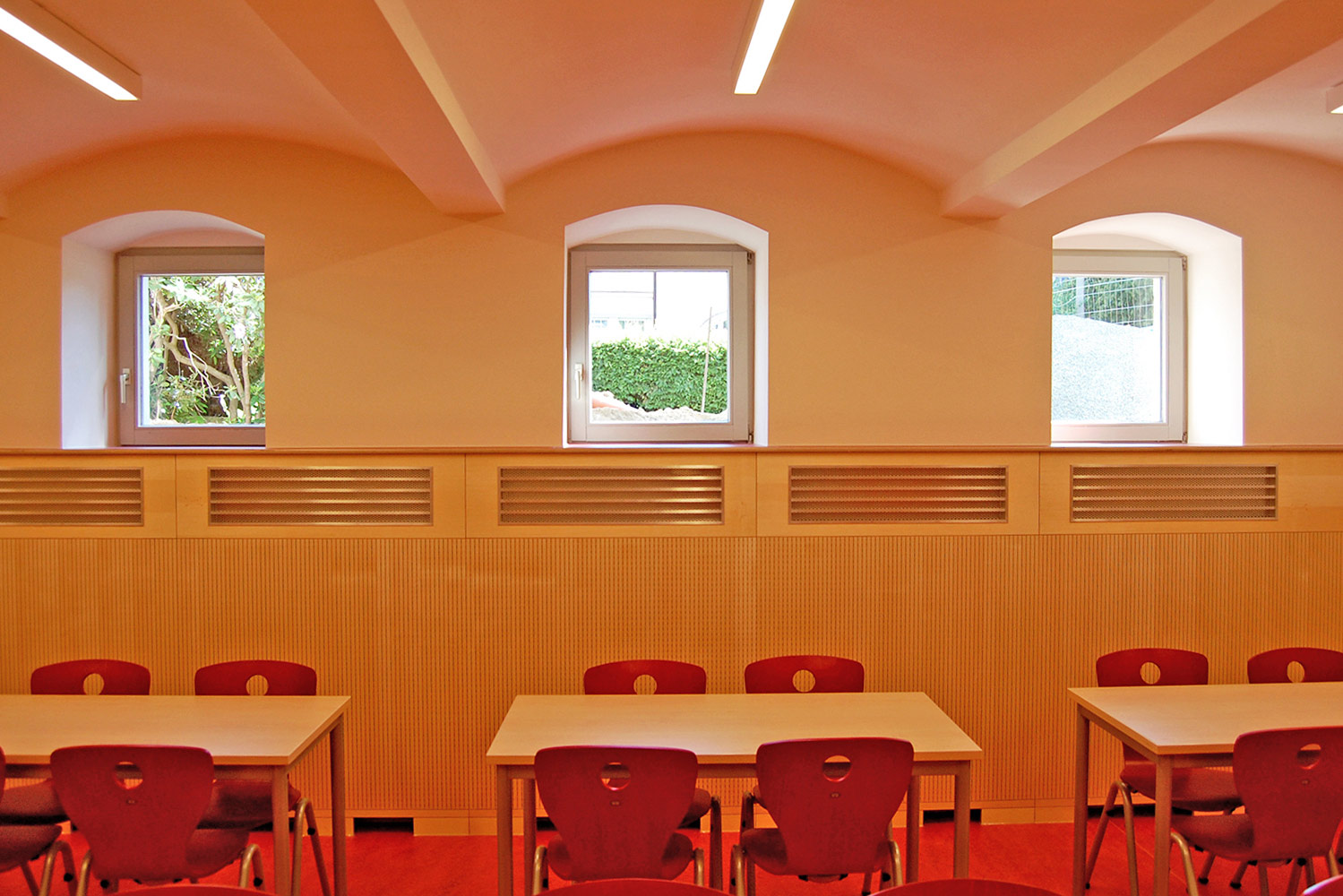 Ziel war es, neben der Trockenlegung des Untergeschosses bislang nicht oder schlecht genutzte Bereiche wie Flure oder und Kellerräume so aufzuwerten, dass zusätzliche neue Nutzungsbereiche so zum Beispiel ein Speisesaal und Werkräume entstanden sind.