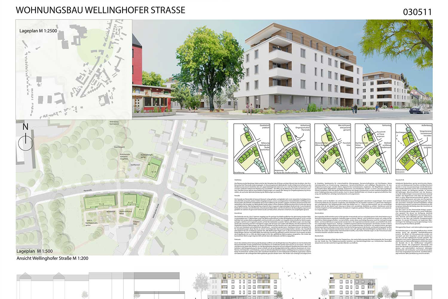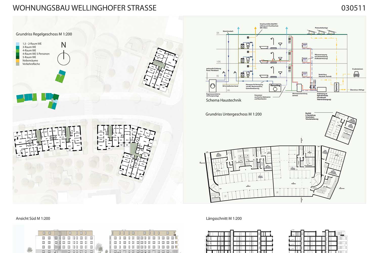 Die Platzierung der Baukörper folgt zunächst den Vorgaben des B-Planes und dem Wunsch des Auslobers, den Straßenverlauf der Planstraße widerzuspiegeln. Im Kreuzungsbereich Wellinghofer Straße erfolgt eine Aufweitung des Straßenraumes durch Eindrehen der sich gegenüberliegenden Volumen um in die Planstraße hineinzuleiten und mit dem südlichen Giebel eine Platzfassung auszubilden. Die Öffnung der Bebauung ist stark am Freiraum orientiert. Darüber hinaus gibt es verschiedene Anpassungen um sowohl den Bezug zur Umgebungsbebauung herzustellen, als auch eine optimale Zonierung der Wohnungen zu erreichen.