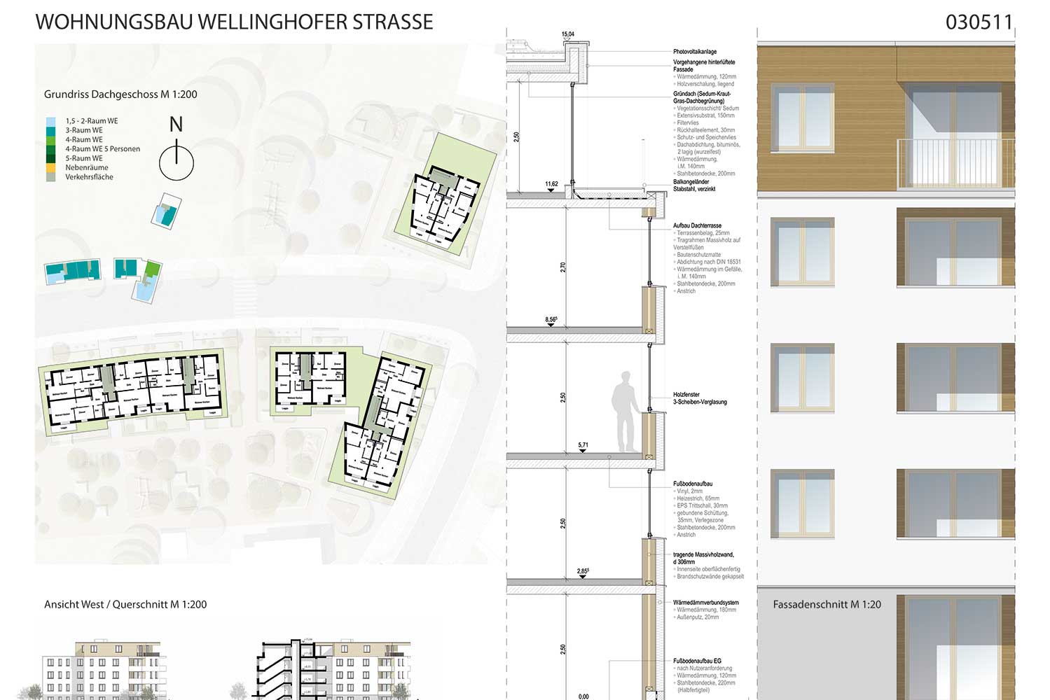 Die Fassade zur Planstraße ist bewusst klassisch ruhig gehalten und gliedert sich in ein verputztes Sockelgeschoss, drei ebenfalls verputzte, jedoch hellere Regelgeschosse und ein zurückgesetztes holzverkleidetes Staffelgeschoss. Die Fassaden der Hofseite sind belebter durch eine Staffelung der privaten Loggien und deren akzentuierende Holzverkleidung. Die Fassaden zur Wellinghofer Straße stellen in Ihrer stärkeren Gliederung durch Einschnitte den Bezug zur Umgebung her. Die Dachgestaltung entspricht dem insgesamt eigenständigen Ausdruck der 3 verschiedenen Gebäude. Es wurden zurückhaltende und preiswerte Materialien und Konstruktionen der Bauaufgabe angemessen gewählt. Ein weiteres Augenmerk hierbei wurde auf Robustheit, einfachen Unterhalt und Langlebigkeit gesetzt.