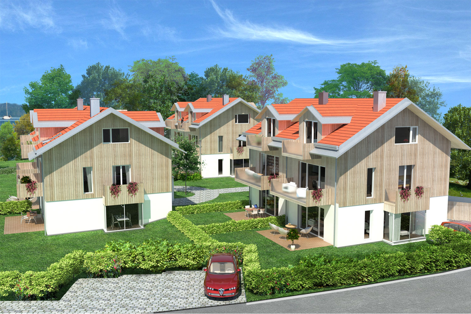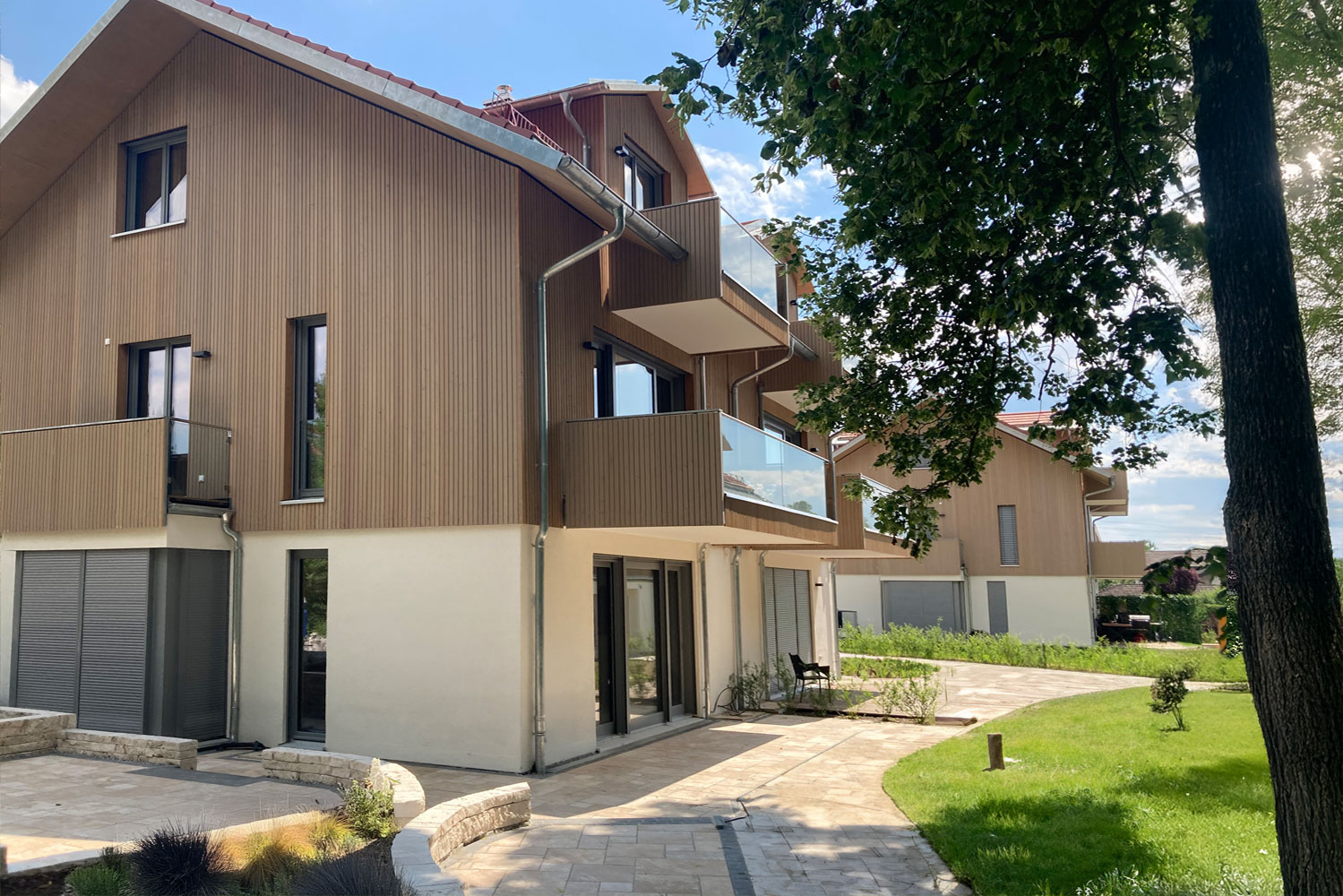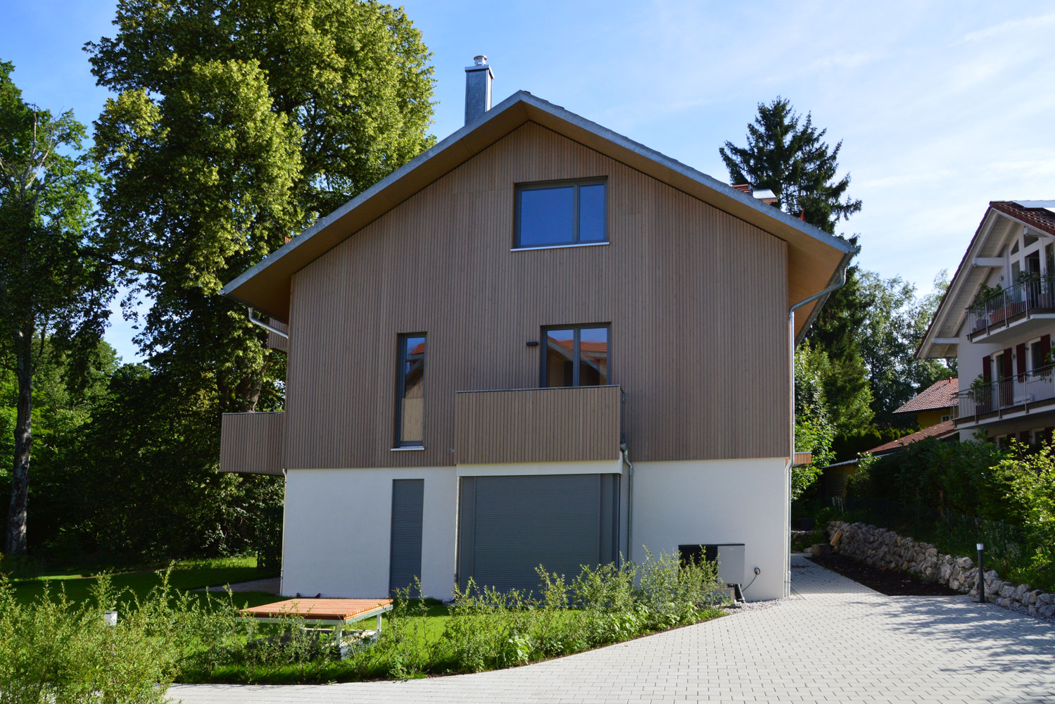 In unmittelbarer Nähe zum Starnberger See ist ein von MBR Architekten geplantes Ensemble aus zwei modernen Doppelhaushälften und einem Mehrfamilienhaus mit gemeinsamer Tiefgarage entstanden.