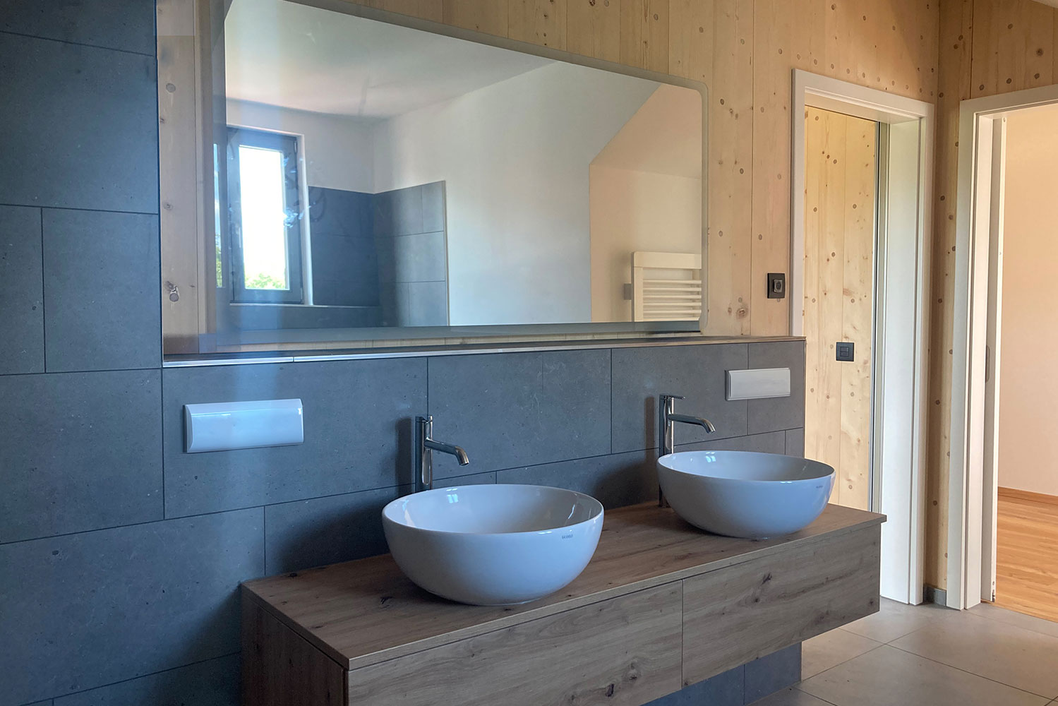 Die Häuser wurden in ökologischer Massivholzbauweise mit Thoma Holz100-Wandelementen errichtet. Die tragenden Holzwände bleiben im Innenraum sichtbar und schaffen ein natürliches, wohngesundes Raumklima mit einer hochwertigen, warmen Atmosphäre.