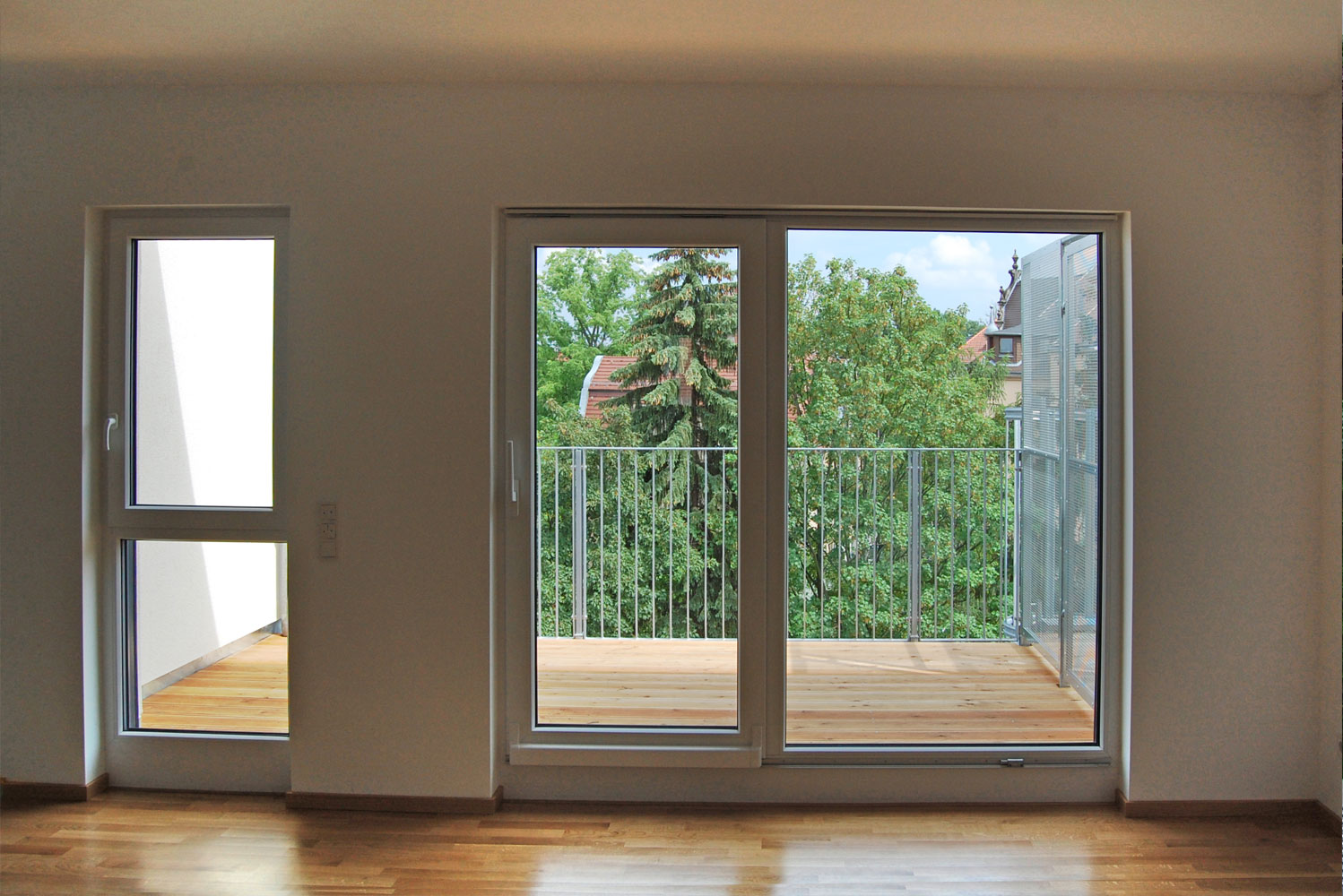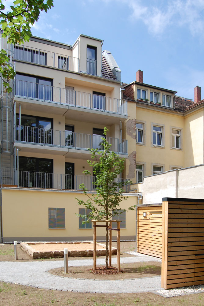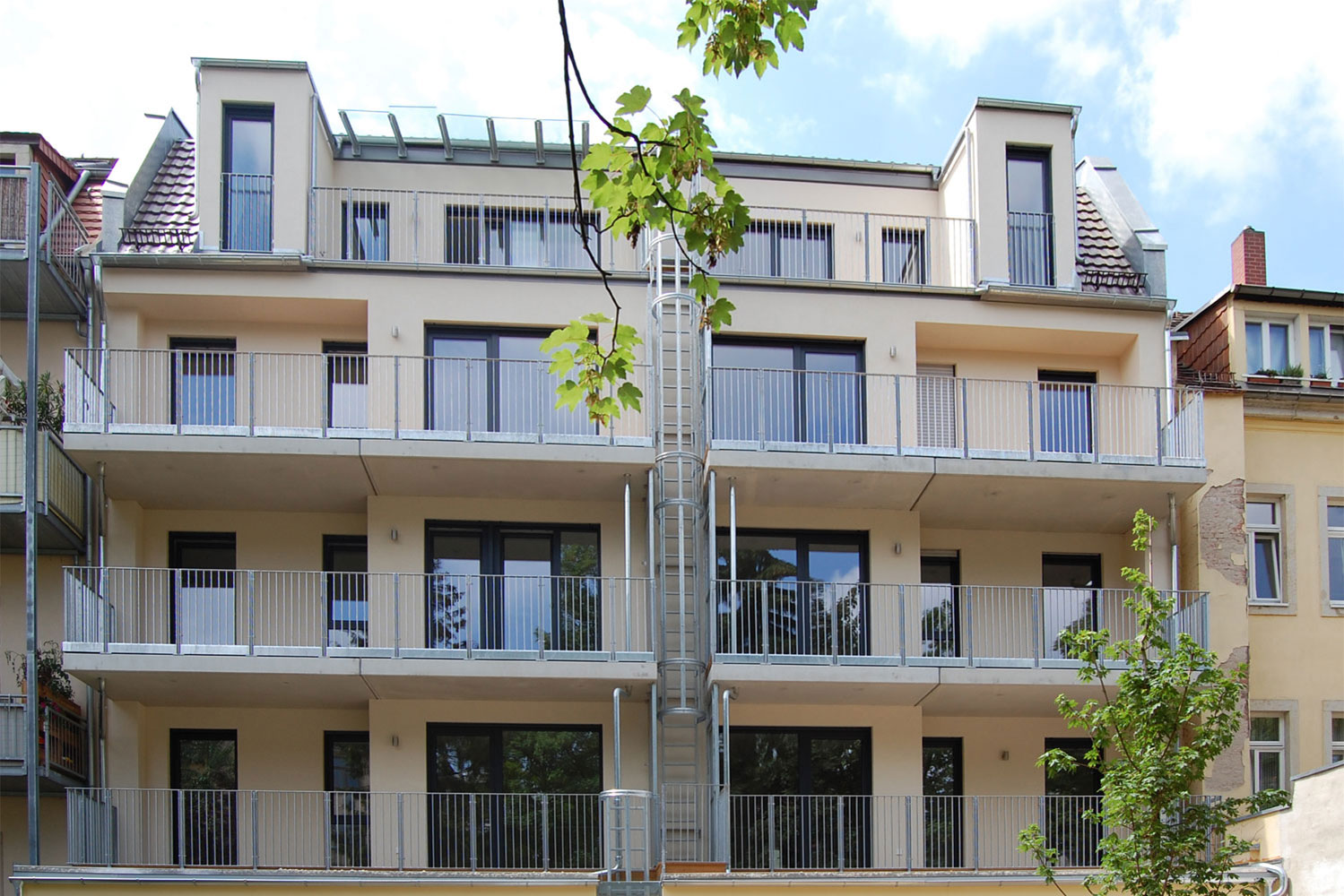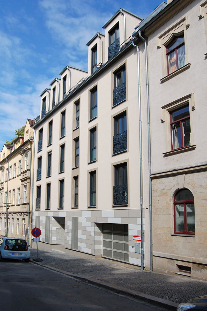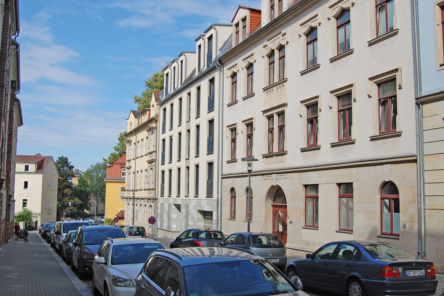 Das Mehrfamilienhaus ist eine Lückenschließung der historischen Straßenfront der Klingenberger Straße in Dresden Plauen.