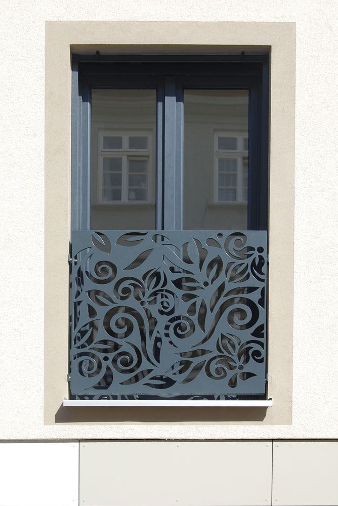 Im Rahmen des vorhanden B-Planes wurde, in Abstimmung mit der Denkmalpflege, eine Fassade realisiert die sich in die vorhandene Bebauung einfügt - sich aber gleichzeitig mit gestalterischen Elementen wie der Vorhangfassade im Erdgeschoss und den ornamental gestalteten Geländern als moderne Ergänzung der Straßenfassaden präsentiert.
