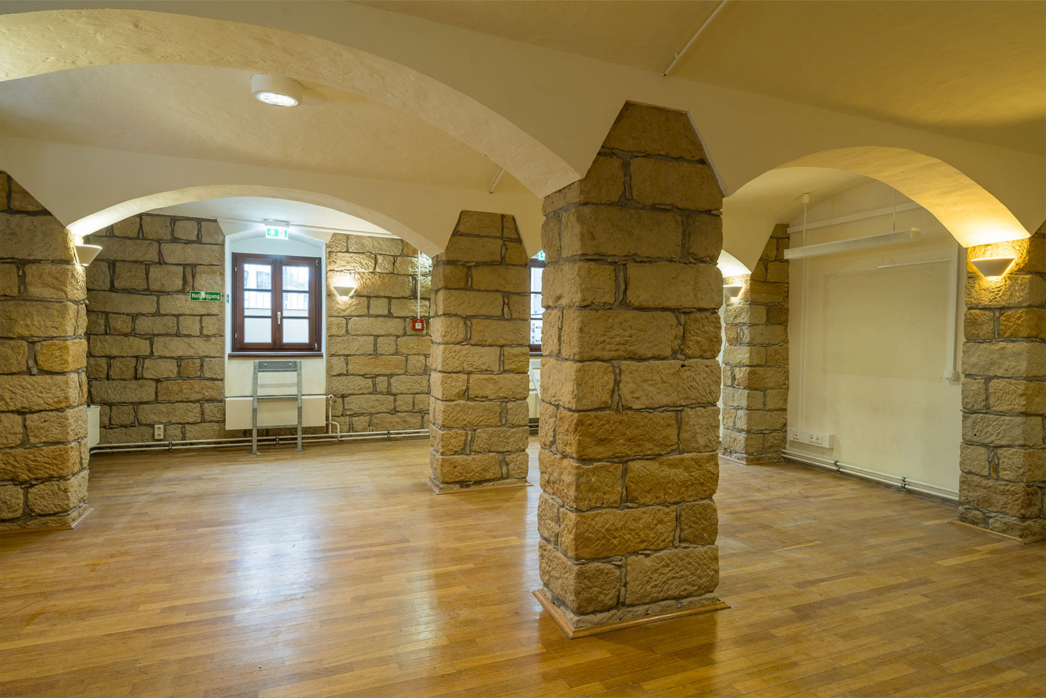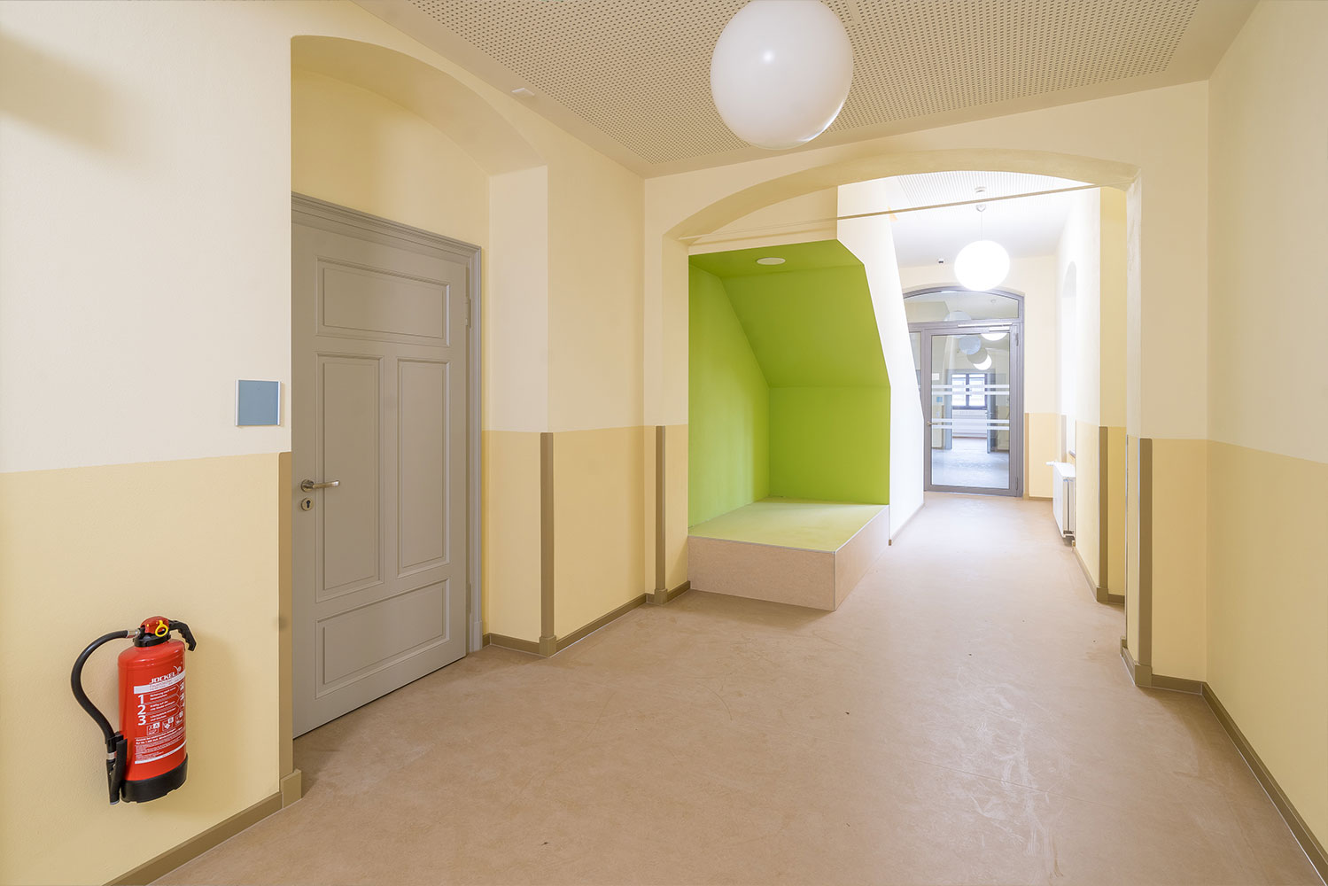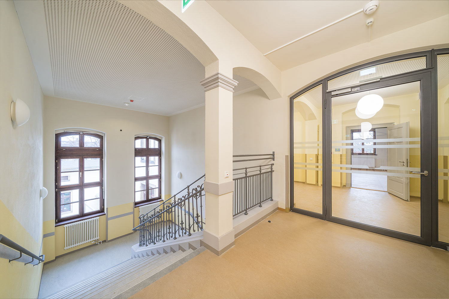 Insbesondere die Arbeiten an historischen Bauelementen wie Türen, Dachstuhl, Treppengeländer erforderte große Sorgfalt und gute Zusammenarbeit mit der Denkmalpflege bis hin zum differenzierten Farbkonzept nach Befundung. Durch Erhaltung der Außentüren trotz Drehrichtungsänderung in Fluchtrichtung hat das Gebäude seine historische Anmutung behalten. Im Inneren herrscht eine lichte, freundliche Atmosphäre mit deutlich verbesserter Lärmdämpfung und Sprachverständlichkeit.