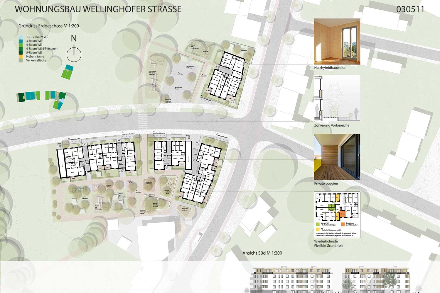Die Platzierung der Baukörper folgt zunächst den Vorgaben des B-Planes und dem Wunsch des Auslobers, den Straßenverlauf der Planstraße widerzuspiegeln. Im Kreuzungsbereich Wellinghofer Straße erfolgt eine Aufweitung des Straßenraumes durch Eindrehen der sich gegenüberliegenden Volumen um in die Planstraße hineinzuleiten und mit dem südlichen Giebel eine Platzfassung auszubilden. Die Öffnung der Bebauung ist stark am Freiraum orientiert. Darüber hinaus gibt es verschiedene Anpassungen um sowohl den Bezug zur Umgebungsbebauung herzustellen, als auch eine optimale Zonierung der Wohnungen zu erreichen.